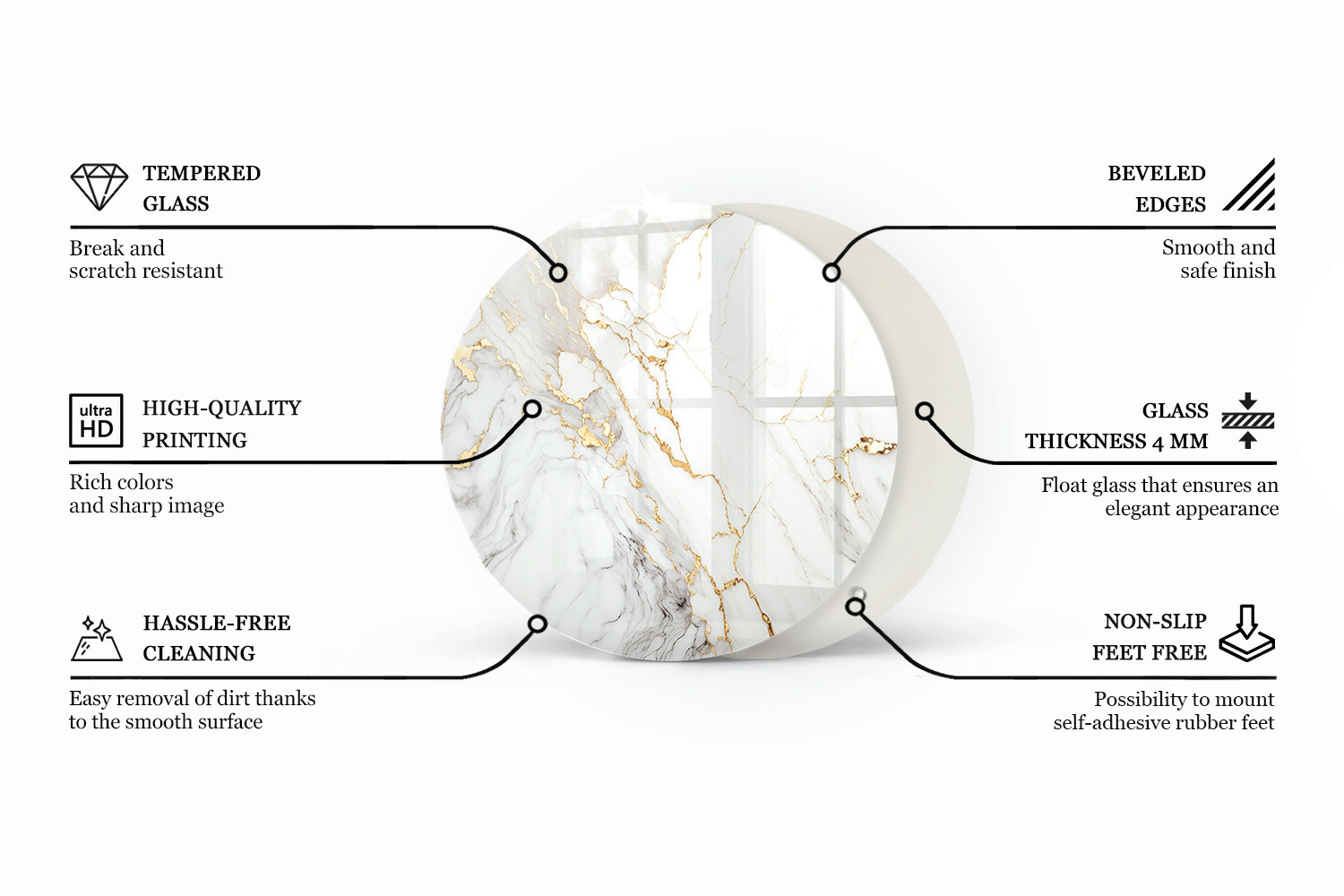 Redefine the character of your interior with an elegant round glass table top featuring the Pattern imitating marble motif—a unique accent that immediately draws attention and emphasizes the individual style of any room. Its circular shape brings harmony and subtlety, creating an impression of lightness and fluid space. Thanks to its smooth, glass surface, the top reflects light, brightening the interior and giving it a fresh, modern feel. It is an excellent choice for those who value original design and high-end aesthetics. Whether you are furnishing a living room, dining area, office, or commercial space, this glass table top serves as both a functional piece of equipment and a decorative centerpiece.